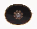 BROCHE en or jaune 750/°° centrée d'une plaque d'onyx et d'un diamant taillé en rose, entourage vermeil. 3.8 x 3 cm. Poids brut :12.3 g.