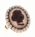 BAGUE en or jaune 750/°° ornée d'un camée en agate doublé, à décor d'un profil de femme, entourage de perles. Tour de doigt :50. Poids brut : 10,5 g.