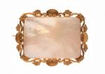 BROCHE de forme rectangulaire en or jaune 750/°° à décor de coquilles et rinceaux entourant une plaque de nacre. Époque XIxème siècle. 7 x 5.5 cm. Poids brut : 26,9 g.