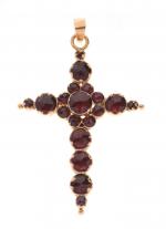PENDENTIF "Croix latine" en or jaune 750/°° ornée de grenats. Époque fin XIXème siècle. 4.7 x 3.3 cm. Poids brut : 4.6 g. Petits enfoncements.