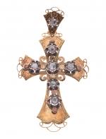 PENDENTIF "Croix" en or jaune 750/°° ciselé et argent, diamants taillés en rose. Travail français, époque fin XIXème siècle. 6.3 x 4 cm. Poids brut :10.0 g. Egrisures, manques.