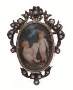 MEDAILLON en argent perles en semence et miniature à décor de putti. Époque fin du XIXe siècle. 3.5 x 2cm. PB 6.0 g.