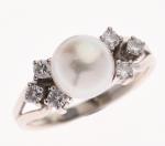 BAGUE en or gris 750/°°centrée d'une perle de culture de 8 mm environ et six diamants. Tour de doigt :55. Poids brut : 4.5 g.