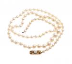 COLLIER de perles de culture en chute de 4.3 à 6.8 mm, le fermoir en or jaune 750/°° ciselé et martelé orné d'une perle. L. 55 cm. Poids brut : 21.38 g. Accidenté, à renfiler.