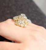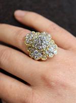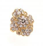 BAGUE "Dentelle" en or jaune 750/°° torsadé, le motif central formé de quatre fleurs sertie de diamants taillés en brillant, la fleur centrale sertie d'un diamant plus important de 0.90 ct environ. Poids total des diamants estimé: 5 ct environ. Tour de doigt : 50 (rétrécissement à l'intérieur). Travail étranger. Poids brut : 14.1 g.