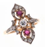 BAGUE "Marquise" en or jaune 750/°° ornée de diamants et rubis. Travail français, vers 1900. Tour de doigt : 51. Poids brut : 4.3 g.