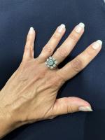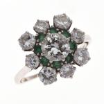 BAGUE "Marguerite" en or gris 750/°° ornée d'un diamant demi-taille calibrant 1.2 ct environ dans un entourage d'émeraudes et entourage de diamants. Travail français, vers 1950. Tour de doigt :58. Poids brut : 5,7 g. Egrisures.