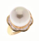 BAGUE en or jaune 750/°° ornée au centre d'une perle de culture de 14.4 mm environ, la jupe l'entourant sertie de diamants baguette. Tour de doigt : 52. Poids brut : 10.6 g.