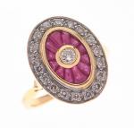 BAGUE "Marquise" en or jaune 750/°° ornée au centre d'un diamant taille brillant de 0.10 ct environ dans un double entourage de rubis calibrés et diamants. Tour de doigt : 58.5. Poids brut : 6.2 g. Petits enfoncements.