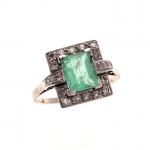 BAGUE Art déco en platine 850/°° et en or gris 750/°° centrée d'une émeraude rectangulaire (manques) entourée de diamants 8/8. Travail français, vers 1925. Tour de doigt : 49. Poids brut : 2.9 g.