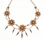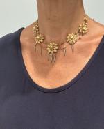 COLLIER ras-du-cou en or jaune 750/°° à décor de fleurs serties de boutons de perles...