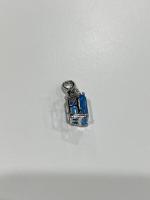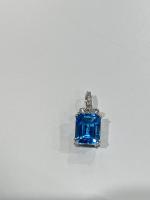 PENDENTIF en or blanc 750/°° orné d'une topaze de taille émeraude calibrant 4,6 ct environ surmontée de deux diamants taille brillant. H. 2 cm. Poids brut : 2,4 g. Topaze irradiée.