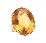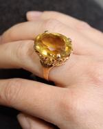 BAGUE en or jaune 750/°° ornée d'une importante citrine ovale de 25 ct environ et mesurant 22.7 x 17.5 x 12 mm. Vers 1960. Tour de doigt : 59. Poids brut :12.3 g. Petites rayures et égrisures.