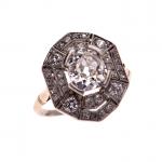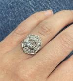 BAGUE géométrique en platine 850/°°, le plateau de forme octogonale serti de diamants demi-taille et taille 8/8 et surmonté d'un diamant de taille ancienne de forme coussin plus important calibrant 1.5 ct environ (mesures : 7.45-6.45 x 4 mm approx). Travail français, époque Art Déco, vers 1925. Tour de doigt : 51. Poids brut :4.6 g. Egrisures, un manque sur le rondiste inférieur. Anneau déformé.