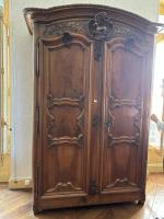 ARMOIRE en noyer à grand cadre mouluré et sculpté de coquille, chien symbole de fidélité et feuillage. Travail lyonnais, époque Louis XV. 270 x 170 x 80 cm.
