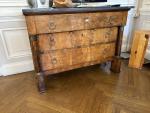 COMMODE en noyer, à colonnes dégagées, dessus marbre. Epoque Restauration. 95 x 130 x 65...