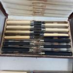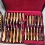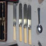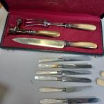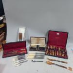 Lot de COUVERTS comprenant douze couteaux grands et douze couteaux à dessert dans un coffret marqué CAILAR BAYARD & Cie à Paris, un service à découper trois pièces avec couteau, fourchette et manche à gigot dans un coffret de la même maison et on y joint un coffret de douze couteaux manches en bois et os et divers pièces de services.