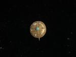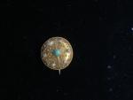 BROCHE en or jaune 750°/°° demi perles et perle de turquoise. décor de rinceaux en applique.
