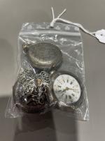 Ensemble de montre de col en argent et métal et chaine cassée. Poids brut : 81.2 g. En l'état. Lots vendus en l'état sur désignation. Lots non présents à l'étude, rendez-vous obligatoire pour la délivrance.