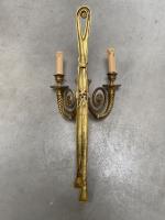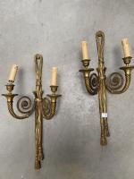 Une PAIRE d'APPLIQUES à deux bras de lumière à décor d'enroulements et tissus. Style Louis XVI. H : 62cm Usures