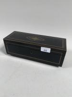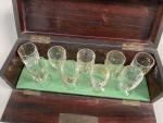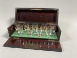 Suite de neuf verres à liqueur sur piédouche, à décor de branches dorées, dans une boîte à gants en bois noirci.