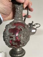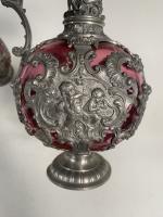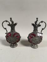 Paire de petites CARAFES à alcool en verre rose et étain, à décor de putti chassant et pêchant. Travail XIXe 24.5 cm