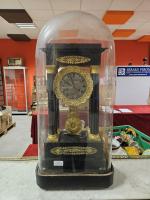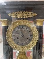 Pendule portique en bois noirci et bronze doré à décor de palmettes. Epoque Restauration. H : 50 cm. Accident au mécanisme et au globe