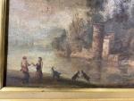Ecole fin XIXe siècle début XXe siècle. Personnage au bord de la rivière. Huile sur toile. 16 x 21 cm. Piqures