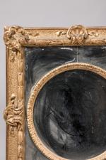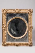 Grand MIROIR rectangulaire à parecloses circulaires en bois sculpté et doré de volutes, coquilles et...