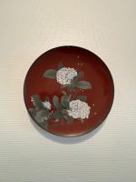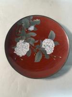 PLAT rond en émaux cloisonnés à décor d'hydrangeas sur fond rouge. Japon, époque Meiji. D 30,5 cm. PA