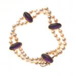 BRACELET à double rangées de perles et quatre cabochons d'améthystes, monture en or 750°/°°. Poids brut : 22,2 g.