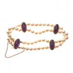 BRACELET à double rangées de perles et quatre cabochons d'améthystes, monture en or 750°/°°. Poids brut : 22,2 g.