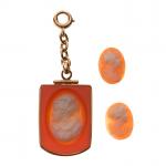 CAMEE agate double face à décor d'une femme et d'un homme, encadrement en or jaune 750°/°°. Poids brut : 7,1 g. On y joint deux petits camées coquillage.