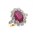 BAGUE Pompadour en or deux tons 750°/°° ornée d'un rubis chauffé de taille ovale calibrant 3 carats environ dans un entourage de 12 diamants blancs taille moderne et un épaulement de deux diamants pour 1,40 carat environ. Tour de doigt : 56,5. Poids brut : 8,5 g. Certificat GGT 6030081.