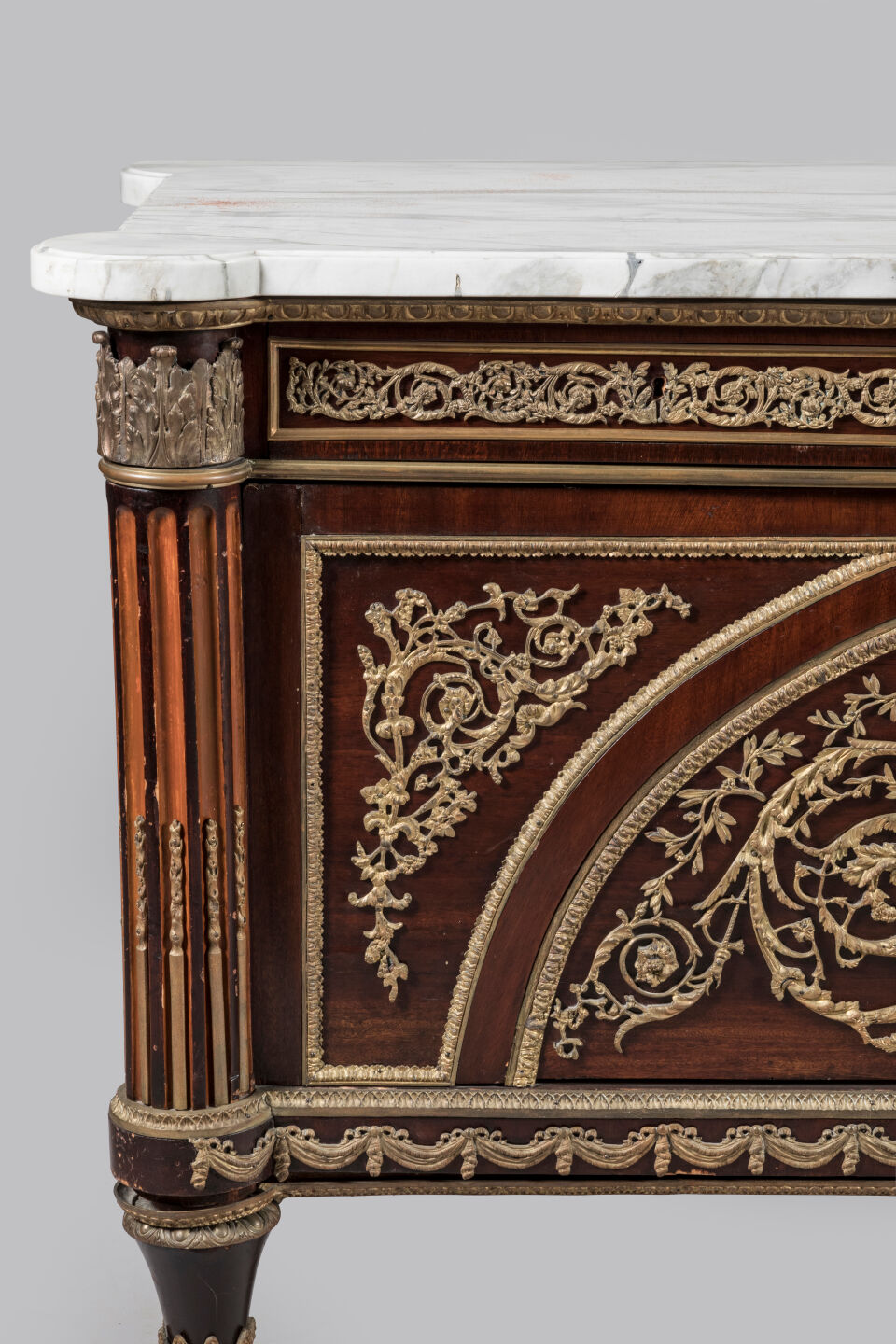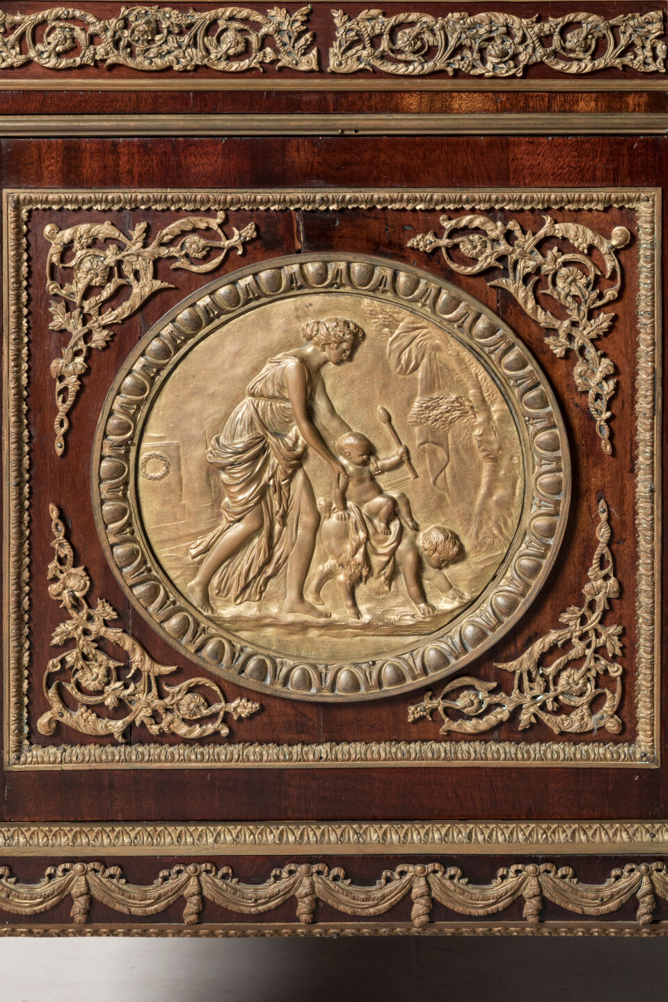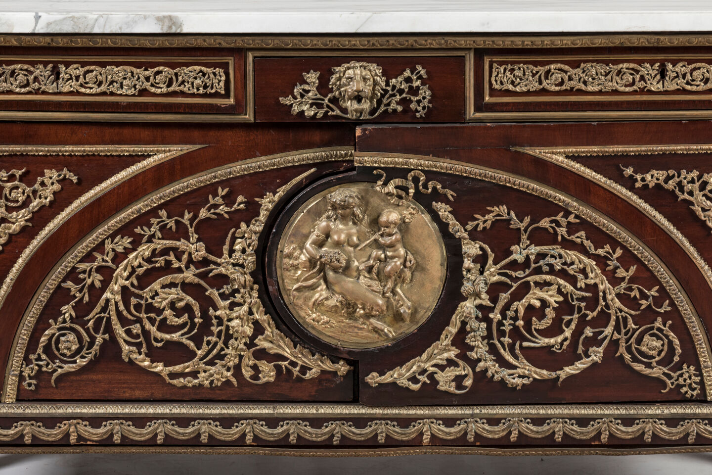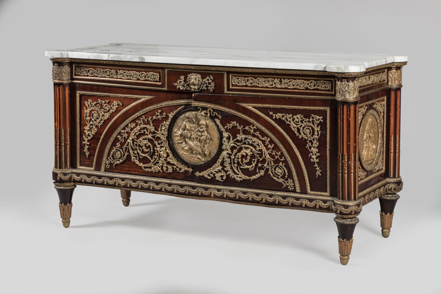 Importante COMMODE d'apparat d'après un modèle commandé par Marie-Antoinette par Benneman et Stöckel en bois sculpté, mouluré et teinté style acajou, ouvrant par deux vantaux découvrant six tiroirs sur trois rangs, ceinture ouvrant par trois tiroirs, à décor de bronzes en applique de rinceaux feuillagés et de trois médaillons en bas-relief d'après Claudion, montants à ressauts en forme de colonnes cannelées rudentées terminés par des pieds toupie, dessus de marbre blanc veiné gris. Travail de style Louis XVI. 98 x 184 x 75 cm. Petits accidents et restaurations.