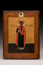 Icône de Saint Pantaléon, patron de médecins et surmonté du Mandylion. Tempera et or sur bois. Russie,...
