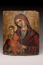 Icône de la Mère de Dieu Hodigitria. Tempera et or sur bois. Manques. École créto-vénitienne, vers 1600. H. 28 x L. 23,5 cm. MC
