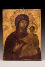 Icône de la Mère de Dieu Hodigitria. Tempera et or sur bois. Usures et restaurations. École créto-vénitienne, XVIIe siècle. H. 29 x 21,5 cm. MC