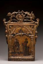 Icône figurant probablement les Saints Sabbas et Antoine. Tempera et or sur bois. Manques et usures. Partie...