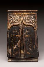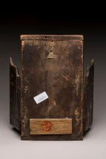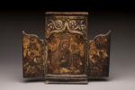 Icône triptyque figurant au centre la Mère de Dieu de la rose immarcescible, à gauche...