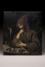 École italienne du XVIIe siècle. Saint François d'Assise en méditation. Huile sur panneau. Soulèvements. H. 37 x L. 32,5 cm. MC