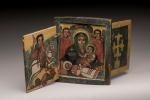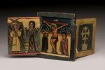 Icône triptyque biface figurant sur une face la Mère de Dieu et Saint Georges terrassant le dragon, l'autre face figurant la Crucifixion, Takla Haymanot et Saint Gebre Menfas Qeddus.
