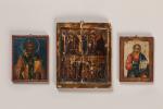 Lot de 3 icônes figurant Saint Jean de Zlatoust, le Christ Pantocrator et une assemblée...