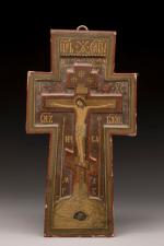 Croix orthodoxe figurant la Crucifixion, signée au dos « P. Sofronov ». Tempera sur bois. Légers...