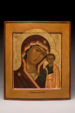 Icône de la Mère de Dieu de Kazan. Tempera et or sur bois. Bon état. Russie, vers 1900. H. 31 x L. 26 cm. MC