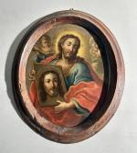 Christ tenant sa sainte Face. Huile sur cuivre, époque XVIIIème siècle. 17,5 x 14,5 cm.