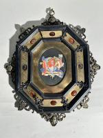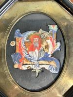 Dans un cadre octogonale en bois noirci à décor en laiton de chérubins et de plaquettes enchâssant des cabochons d'agate. Époque XVIIème siècle. 38 x 31 cm. Accidents et manques.