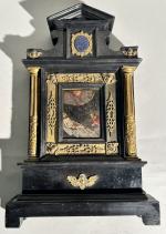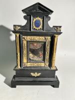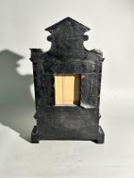 Dans un autel miniature en placage d'ébène, laiton doré et plaque de marbre bleu du temps. Accidents. 45,5 x 29 cm.