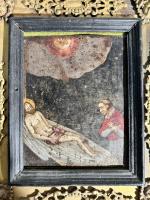 Ecole ITALIENNE Cardinal et le Christ mort Cuivre 11 x 8,5 cm Dans un autel miniature en placage d'ébène,...
