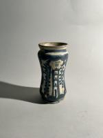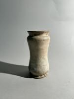 ALBARELLE en faïence peinte en camaïeu bleu à décor de paysage. Italie, fin XVIIème siècle. H. 19 cm. Restaurations.